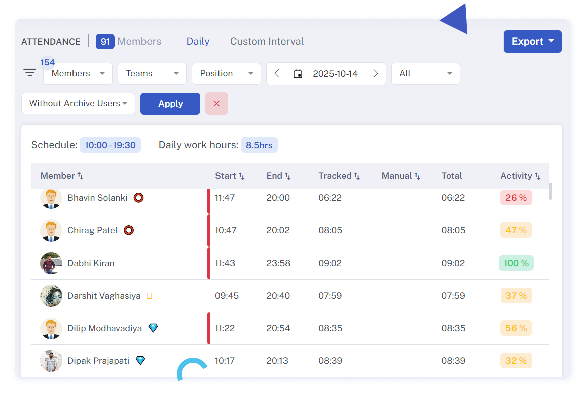 - Utilize filters for early leaving, late coming, and absent, conveniently selectable from drop-down menus.