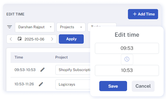 Our time editing feature addresses instances when employees overlook or are unable to track their hours due to various reasons, such as being engaged in off-computer work tasks. In such scenarios, team members can request time edits by providing brief descriptions. Subsequently, owners or executive managers can approve or reject these requests. Approved adjustments are seamlessly integrated into the total working hours.